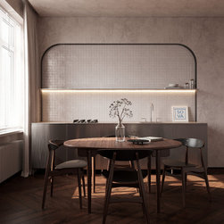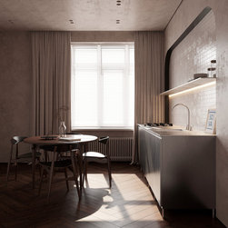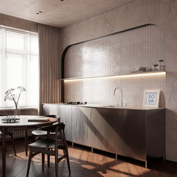 This is a project for a small kitchen in a compact apartment, featuring a spacious dining table and modern metallic-finish facades. A minimalist decorative shelf with integrated lighting replaces upper cabinets, maximizing space and maintaining functionality.