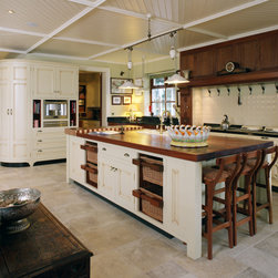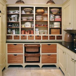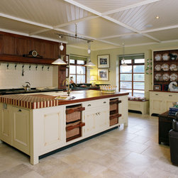 A wide range cooker sits amongst a row of base units, beneath a tiled backsplash and huge wood mantle. At the centre, a large kitchen island features wicker basket drawers, butcher block worktop and farmhouse-style integrated sink with a brass tap. To one side, a window seat offers a cozy nook beneath a window, and to the other a large set of cream cabinets bends around the corner displaying a collection of vintage decorative ceramics. Behind the tall cream units, a small pantry is designed with ample storage within easy reach.