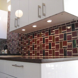 Full tile splash using Heath Tile. Tile Pattern by Robert Nebolon Architects called the "Marimekko" pattern