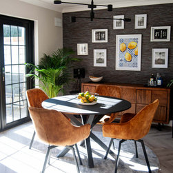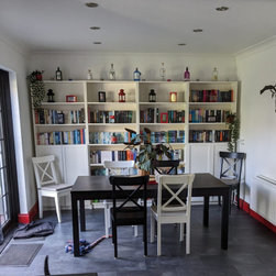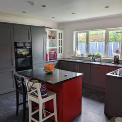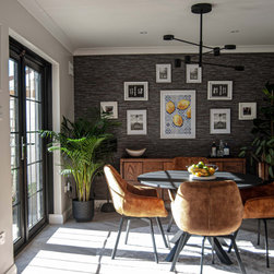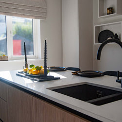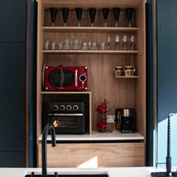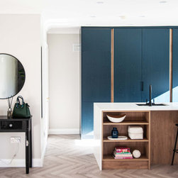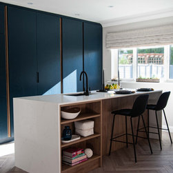 A modern, minimalistic kitchen designed to make the most of a compact space. Tall cabinets with pocket doors provide smart storage, while bold navy finishes and a sleek waterfall island bring sophistication and style. The result is a space that feels both functional and effortlessly elegant.