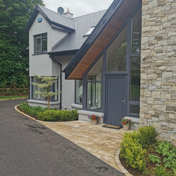 Natural sandstone paving at front doorway. Planting either side.