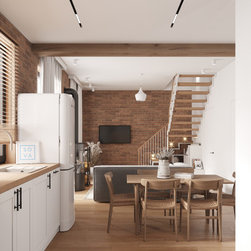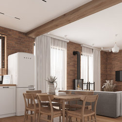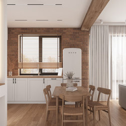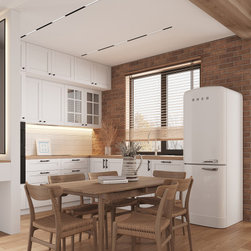 This kitchen is designed in a rural modern style with milled facades. It's simple and minimalistic yet highly functional. Equipped with all necessary appliances and featuring a spacious dining table, it combines practicality with elegance.