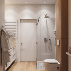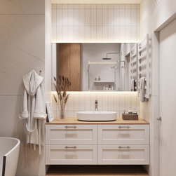 This bathroom is designed in a rural modern style, featuring a built-in wardrobe and a convenient wall-mounted vanity unit. It includes a shower cabin and shelves for cosmetics, providing both functionality and a contemporary aesthetic.