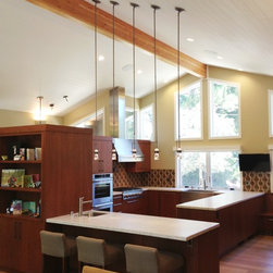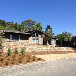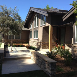 The living room, the dining room and the kitchen are all under a new Great Room Roof which is the new dominant feature as seen from the street. Low water landscape design surrounds this beautiful remodel.