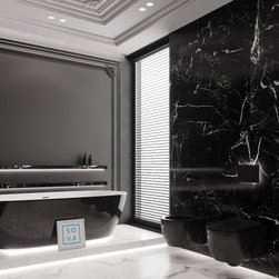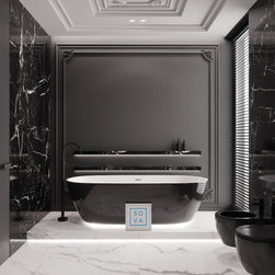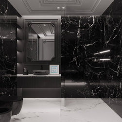 Our extraordinary bathroom project featuring a striking contrast of colors with black marble tiles and intricately carved black wall panels. Light flooring, ceiling, and accent lighting are highlights of the project, adding to its allure. A suspended vanity unit serves a practical purpose, while...
