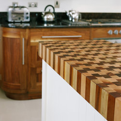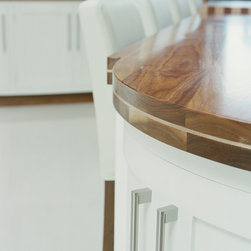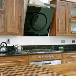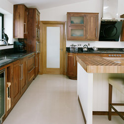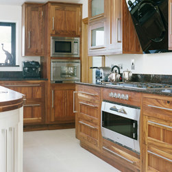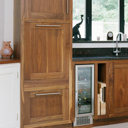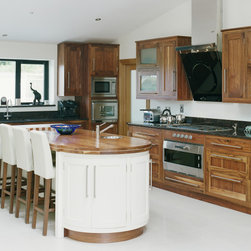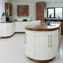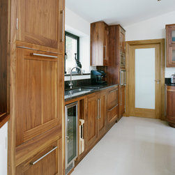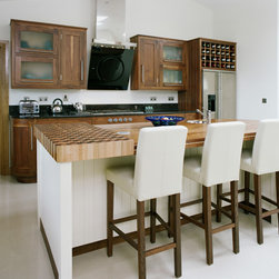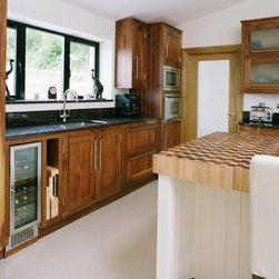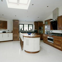 This two-tone in-frame shaker is built with warm and rousing walnut cabinetry along with units in crisp white. Sleek handles are plated in polished chrome for a modern edge, and match with the accompanying sinks, taps, and stainless-steel appliances. Speckled black granite form the countertop and upstand, except for the island which features a thick walnut worktop with a maple inlay and a butcher-block top. Tongue-and-groove panelling and frosted glass accents add visual interest amongst an already exciting pallete.
