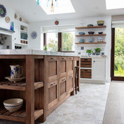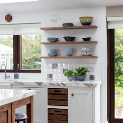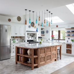 This two-tone in-frame shaker design pairs fresh white cabinetry with a central island and accents in rich dark oak. A playful mix of oak knobs, grey-painted knobs, and satin nickel handles adds subtle visual interest, while extra-thick marble worktops and a tiled backsplash with patterned insets bring depth, texture, and a touch of vintage artistry.