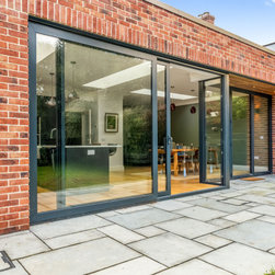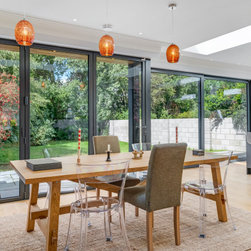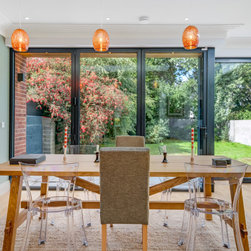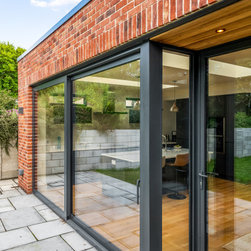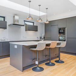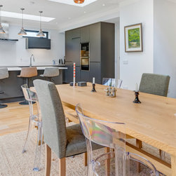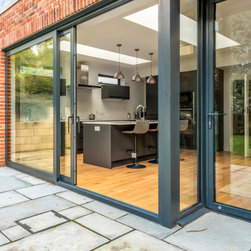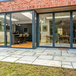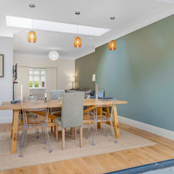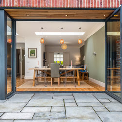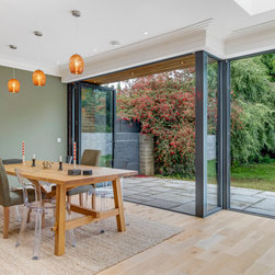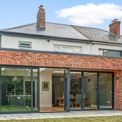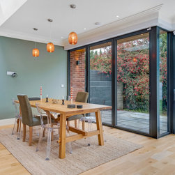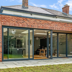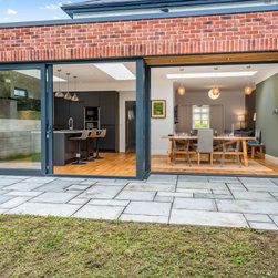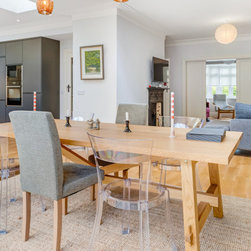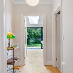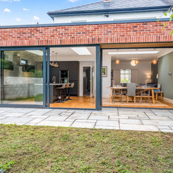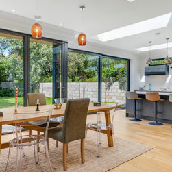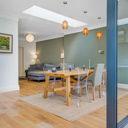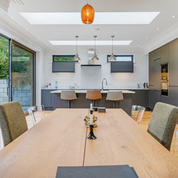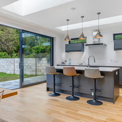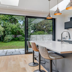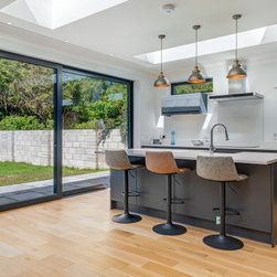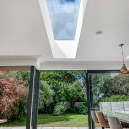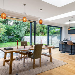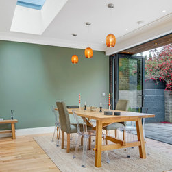 A single-storey rear extension to a 1930’s dwelling, designed to form an open-plan kitchen and dining area that integrates seamlessly with the existing living spaces. The proposal establishes a clear dialogue between the historic fabric and contemporary intervention, blending traditional character with modern functionality. A raised ceiling incorporating high level windows and rooflights introduces abundant natural light, enhancing the sense of volume and spatial quality. Full-height sliding doors to the kitchen and bifold doors to the dining area offer flexible connections to the external terrace, fostering a strong visual and physical relationship between the interior and the garden.