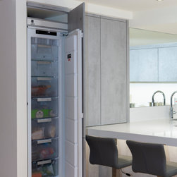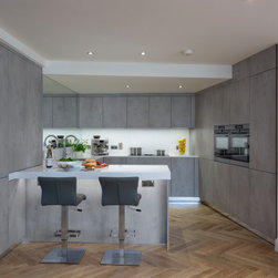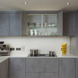 Push-open cabinetry and wall panelling are finished in a concrete-effect surface, lending the space a minimalist, industrial character. Krion Crystal White surfaces form the worktop in varying thicknesses, folding between cabinet doors, and folding up into a 200mm upstand and full-height backsplash. The modern design language is continued through appliances in gloss black and gunmetal grey, as well as the chrome Quooker tap paired with a Blanco pebble-grey sink. Subtle indirect white lighting enhances the clean lines and lends the kitchen a soft, futuristic glow.