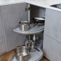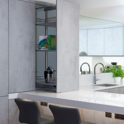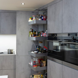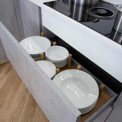 The design is rich with carefully considered details with efficiency and ergonomics in mind. Pull-out shelving, pull-swing larders, and LeMans carousel units maximise storage without sacrificing comfort within the kitchen’s compact footprint. Wooden plate holders and cutlery inserts maintain order and clarity, reinforcing the kitchen’s disciplined aesthetic. Appliances