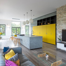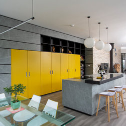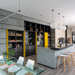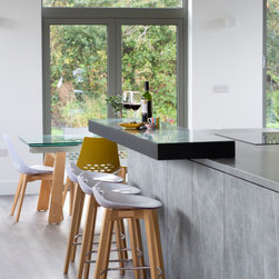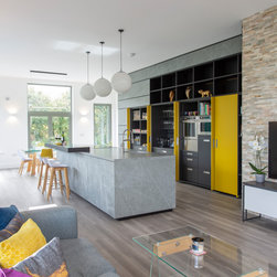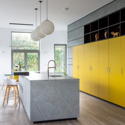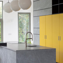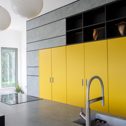 The one-wall layout is defined by a dramatic expanse of grey ceramic wall panelling, punctuated by backlit display shelving and a long run of pocket-system doors in radiant curry yellow. This wall of cabinetry is complemented by a matching island featuring a 40mm ceramic worktop and black breakfast bar, offering generous prep space and a bold visual introduction to the room. Each door and internal drawer opens effortlessly via stainless-steel grip recesses or push-open systems, emphasising the kitchen’s appeal to clean lines and seamless integration.