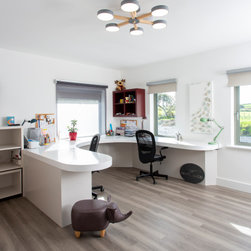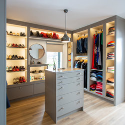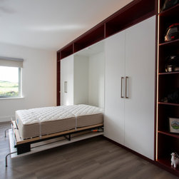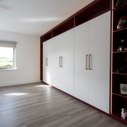 Beyond the kitchen, the project also included a bespoke walk-in dressing room finished in truffle brown satin with recessed lighting, and a home office with white doors, a ruby-red satin carcass, Corian desktop, and a fold-down guest bed.