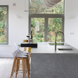 Behind the sleek façade is thoughtfully designed organisation. The first two pairs of pocket doors reveal a fully equipped larder and breakfast station, complete with tiered drawers for optimal storage. At the opposite end, all appliances are grouped together for efficiency—oven, combi, elevated dishwasher, and larder fridge sit neatly side by side. The island hosts both an induction hob with downdraft extraction and a submerged sink fitted with a Blanco tap, with pullout bins and additional closed storage.
