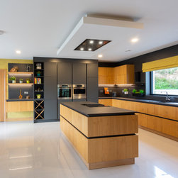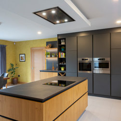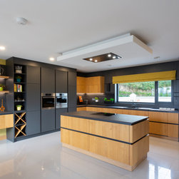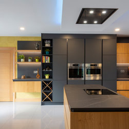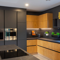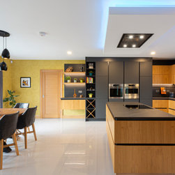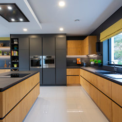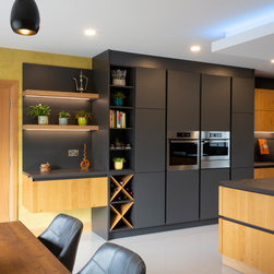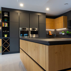 Base and wall units are dressed in Natural Knotty Oak while tall units are finished in a Lava Black Glazline. Doors are handless and instead are opened by an onyx black grip ledge which separates doors into pleasing parallel rows. Keyla forms the worktop and mediates between the two cabinet finishes with its dark marble with light streak finish.