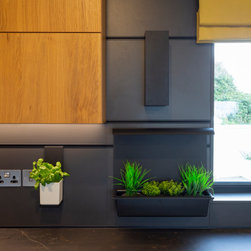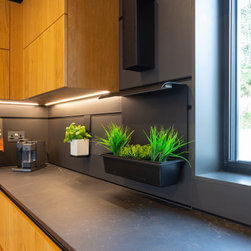 The space is easily decorated with open display cabinets, floating shelving, and a unique recess panel system for suspended shelving and planters in place of a backsplash. Appliances, sink and tap finished in stainless steel highlight key areas of work within the kitchen. A ventilation hood recessed to an above bulkhead preserves clear sightlines into and out of the kitchen.