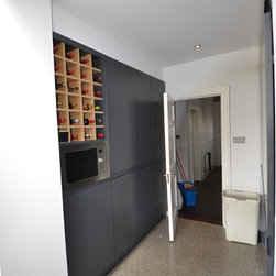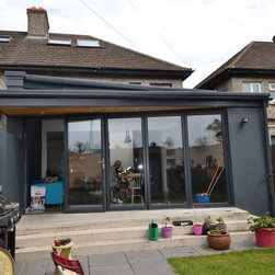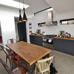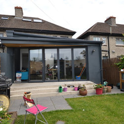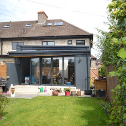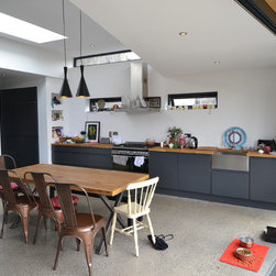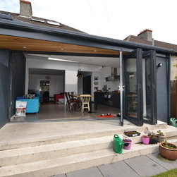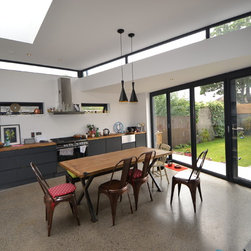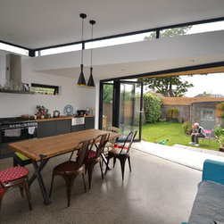 A contemporary and industrial-style renovation of a semi-detached home, featuring a clerestory window that creates the illusion of a floating roof, angled to maximise sunlight throughout the day. Bifold doors open the interior directly onto a raised, covered patio, which steps down seamlessly into the garden