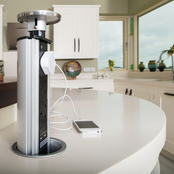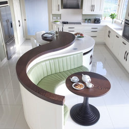 Made up of hand-made curved cabinet, this island features a cleverly incorporated seating area with plush green cushion paired with a custom-made coffee table, and a rounded solid wenge breakfast bar at the tail end. The island also features easily accessible pop-up electrical sockets.