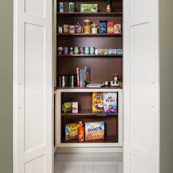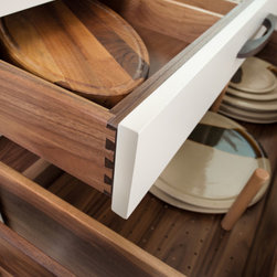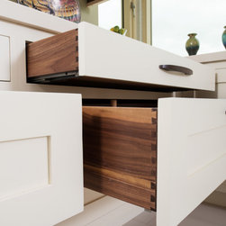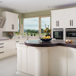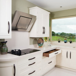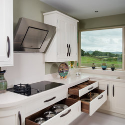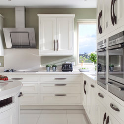 Wenge handles make for a strong statement when held by vanilla painted classic shaker cabinets, topped with Corian worktops and backsplash. Drawers are joined together in traditional dovetail, and 30mm cabinet doors are hung by exposed butt hinges.