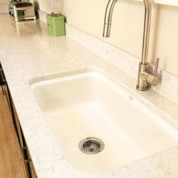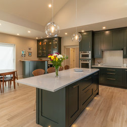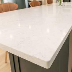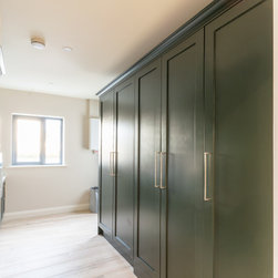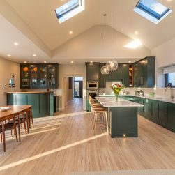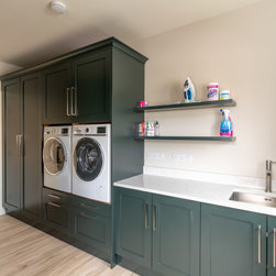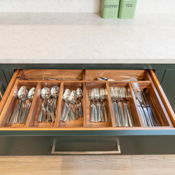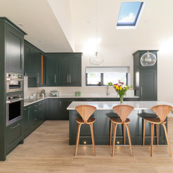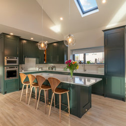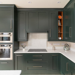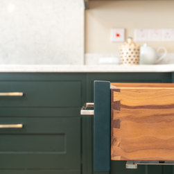 A contemporary take on classic inframe shaker cabinetry sets the tone for this sophisticated space, all handmade in our workshop and finished in Farrow & Ball’s richly pigmented ‘Studio Green’. The deep, velvety cabinetry is complemented by slim stainless-steel pulls, while the Pearl Jasmin quartz worktops and splashbacks introduce a crisp contrast to the ornate wood accents. Warm-toned lighting softens the hard angles and edges of modern geometry, for a refined yet homely finish.