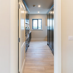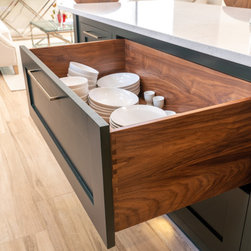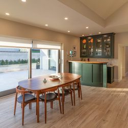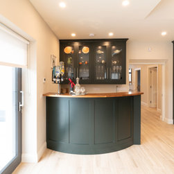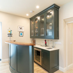 The fully bespoke wet bar is finished to match the kitchen cabinetry, and is outfitted with its own sink, wine cooler, and integrated spirit dispenser. Glass-fronted wall cabinets with internal lighting elevate the bar’s elegance, while practical in keeping glassware within reach. The warmth and richness of walnut is thoughtfully used throughout the kitchen—appearing in the open shelving, hand-cut dovetail drawers, bar top, and sculpted dining table—weaving a continuous thread of natural luxury and depth into the space.