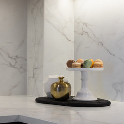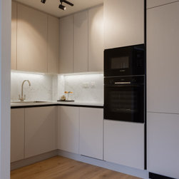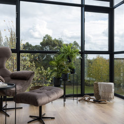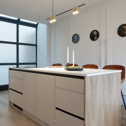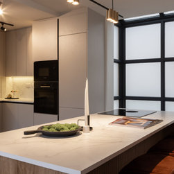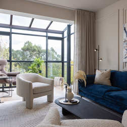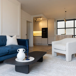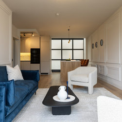 Modern open-plan living with timeless elegance. A deep-blue velvet sofa, ivory armchairs, and a sleek black coffee table create a refined lounge area. The light-toned kitchen with integrated appliances and a wooden island adds warmth, while the black-framed glass partition brings in soft natural light. A perfect balance of style, comfort, and sophistication.