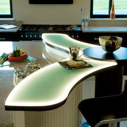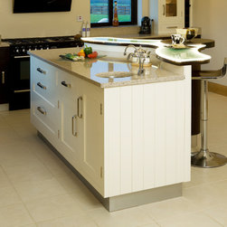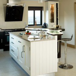 Traditional roots anchor the design through tongue-and-groove panelling, the shadow gap between square cornice and ceiling, and the dovetailed solid-wood joinery that reflects enduring craftsmanship. Yet these familiar details are set in deliberate contrast to the flowing, almost sculptural form of the curved island, complete with integrated LED lighting that illuminates the frosted-glass breakfast bar top in a not-so-subtle, ethereal glow.