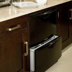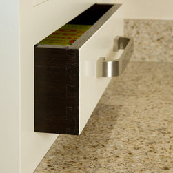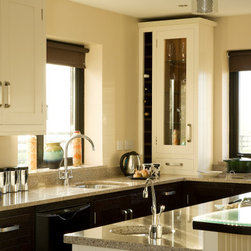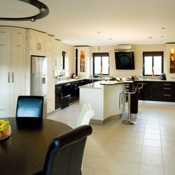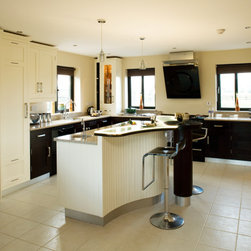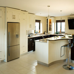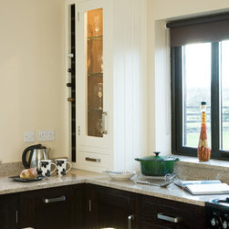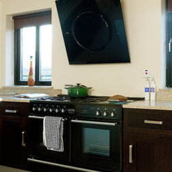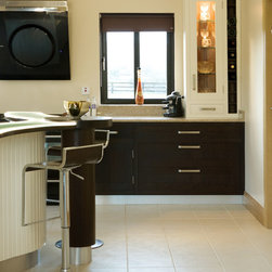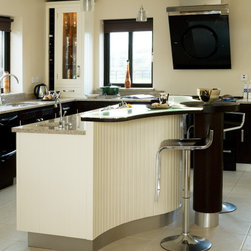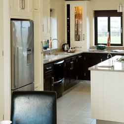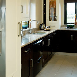 In-frame cabinetry reveals a striking interplay of contrast: natural dark wenge timber set against off-white painted finishes, mediated by a soft cream granite worktop. Chrome hardware and gloss-black appliances emphasise the contrast even further, while lending the space an almost futuristic edge.