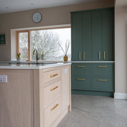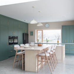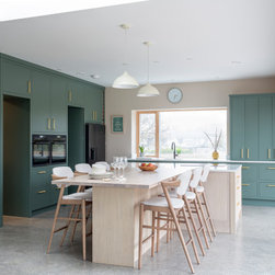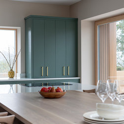 Constructed primarily as inframe slab, the cabinetry is painted in a matte greyish turquoise that’s been specially applied to allow the expressive oak grain to subtly emerge through. The light oak island and integrated dining table sit harmoniously against soft taupe walls, while crisp white quartz worktops and upholstered bar seating lift and brighten the entire space.
