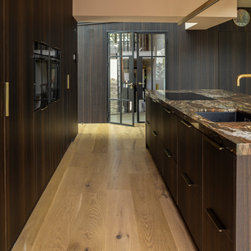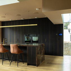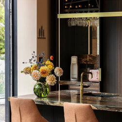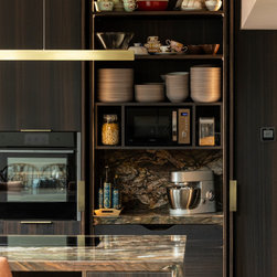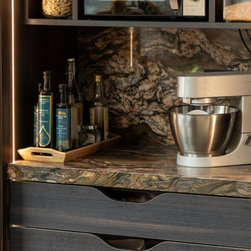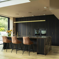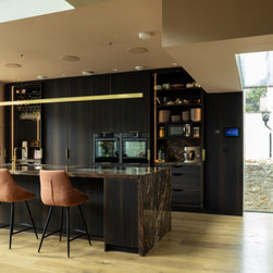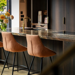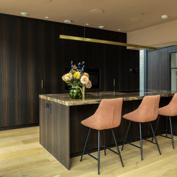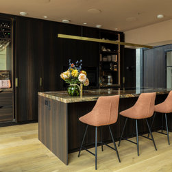 The result is a kitchen of dark modern sophistication with an organic edge, where bold choices in materiality interplay amidst a highly functional space. It is at once dramatic, composed, and undisputedly luxurious.