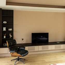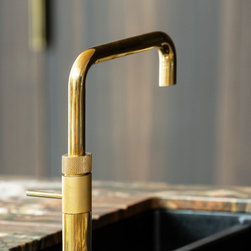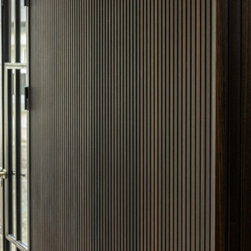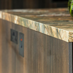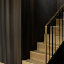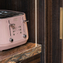 Dark charred wood dominates the space; its warmth and drama refined into the clean-lined geometry of lay-on slab cabinetry. Deeply rich and exciting stonework commands attention as the island’s worktop, cascading in a waterfall edge, then reappearing within the cabinetry as both surface and backsplash. Minimalist hardware in brushed brass and thin vertical rows of warm cabinet lighting bring lightness to the darkness, while visually marrying the grounded timber to the fluid energy of the stone.
