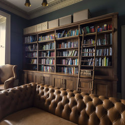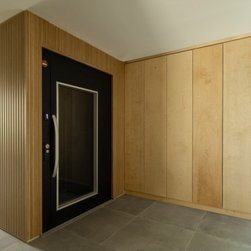 Along the one-wall layout, a large integrated fridge-freezer blends seamlessly into the cabinetry, while twin Neff ovens are set flush at counter height to preserve the clean, uninterrupted lines. Full-height pocket doors conceal and reveal countertop appliances and dinnerware, leaving them out of sight but always within easy reach. On the island opposite, an undermounted sink with Quooker tap is paired with a discreet flush-mounted hob, while the extended worktop provides a welcoming zone for casual dining.