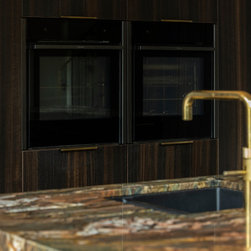 At once dramatic and disciplined, this sophisticated kitchen blends the depth of burnt timber and movement of swirling stone with a functional clarity that keeps the space sharp, clean, and refined.