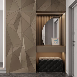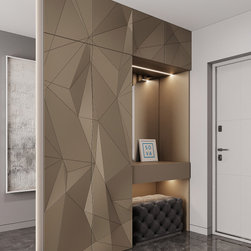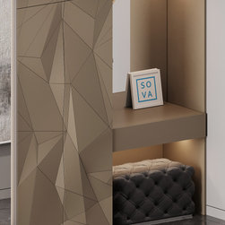 The wardrobe in a modern design. 3D facades raised panel and warm lighting.