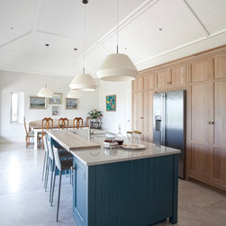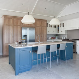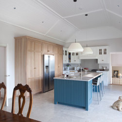 Beaded-Face Frame cabinetry houses beaded shaker doors, hung by exposed butt-hinges and fitted with quintessential knobs. Units are decorated with solid-wood curved cornicing and tongue-and-groove wood panelling.