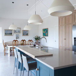 The Faded blue island is the designated cleaning and prep area, with an undermounted sink, integrated dishwasher and pull-out bins. A breakfast bar with seating encourages relaxed conversations while another cooks and cleans.
