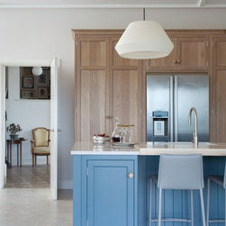 The 3 different colour tones actually cleverly divide the kitchen into 3 separate zones of function: Tall units finished in character oak with beautiful natural grain consolidates an abundance of food storage, alongside the large American style fridge/freezer.