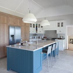 This open-plan and traditionally styled kitchen is bright and cheerful, with a 3-tone palette diving the kitchen into storage, cooking and cleanup.