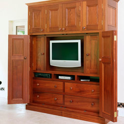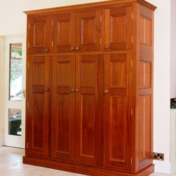 The rich, reddish tones of the sapele paired with the pale mint cabinetry create a palette that feels both refreshing and nostalgic. Delicate bespoke details such as corbels beneath wall units and between cabinet feet add moments of charm throughout.