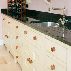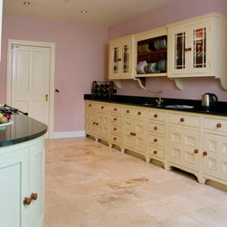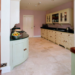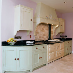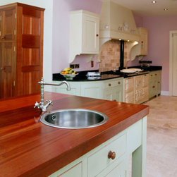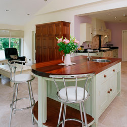 In-frame cabinetry with beaded shaker doors is crafted from tropical sapele, its natural warmth accentuated through hand-painted mint finishes applied later in the kitchen’s life. Doors are hung on exposed brass butt hinges and opened with solid knobs, reinforcing the kitchen’s authentic, heritage character. Black speckled granite forms the worktops and upstand along with a solid sapele island worktop, while a cement tile backsplash behind the cooker hob introduces texture and visual interest.