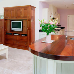 The galley layout is arranged with a bespoke canopy hood and flanking wall units, supported by decorative corbels, float above the Aga range, facing an undermounted sink, drawer packs, plate rack, and glazed wall cabinets. Beyond the main run, the island is pulled outward to the living area, complete with a secondary sink and seating. An integrated fridge-freezer and pantry cabinets mirror a nearby media unit, which has been intentionally left unpainted to celebrate the beauty of the raw timber.