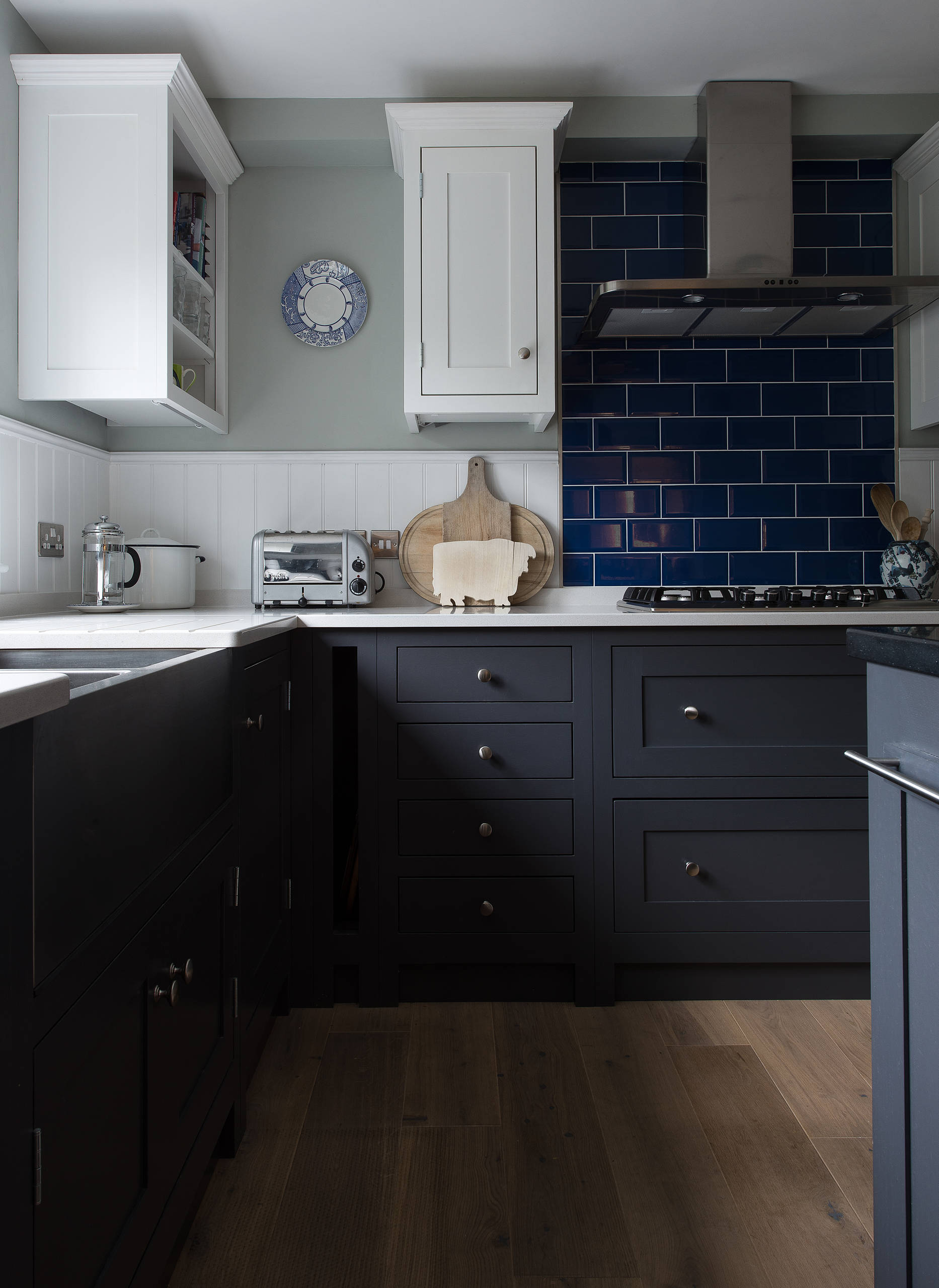 Look closely at these units and you’ll see the colour is an ashy, chalky off-black, rather than uncompromisingly sharp jet. This sort of finish lends itself well to a pairing with a comparably soft shade of green on the walls. The deep blue tiles also look great here and don’t clash, since the base unit colour has undertones of the same shade. The blue and white plate is a small detail, but really connects these two surfaces visually.