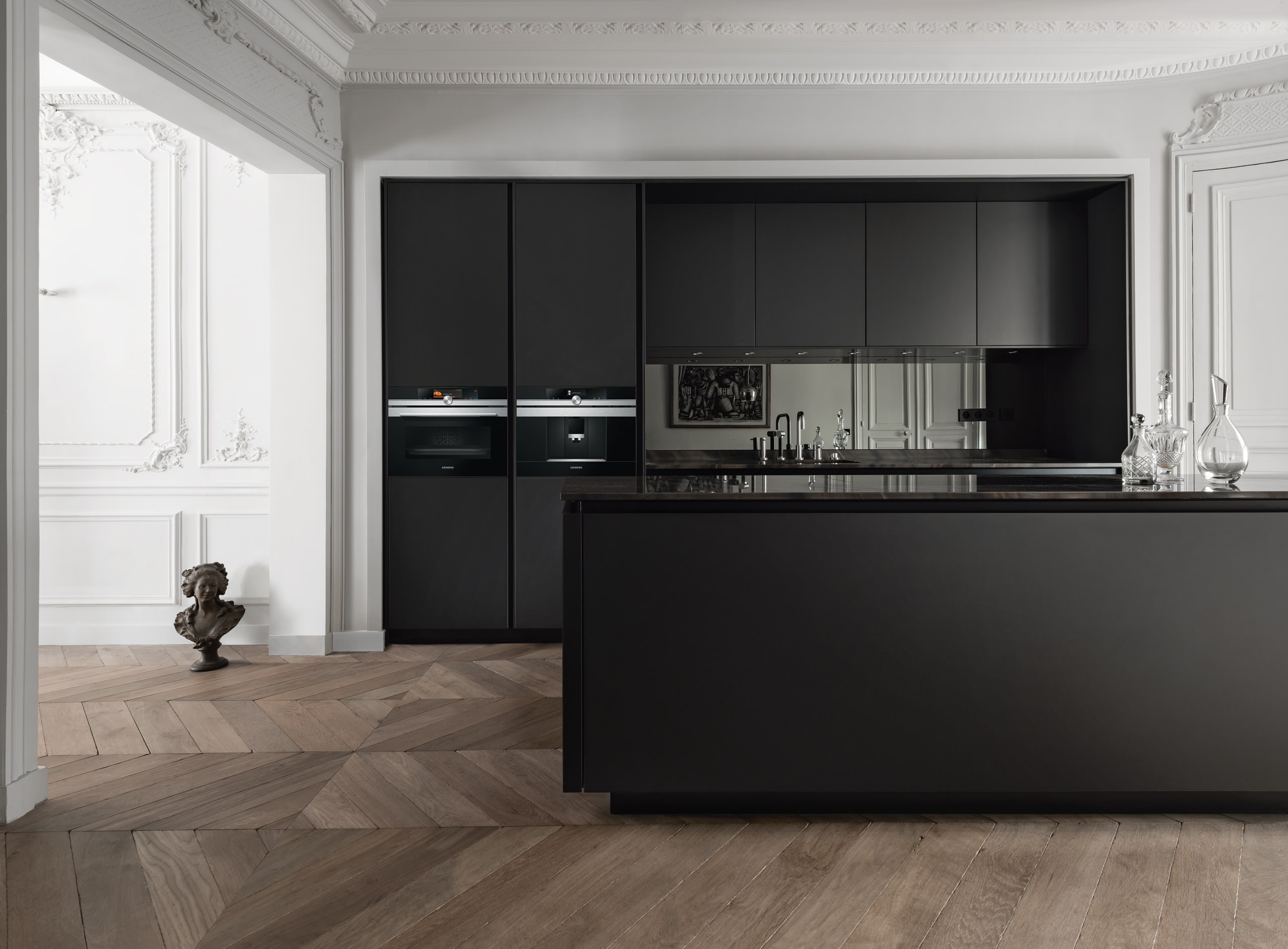 In this kind of context, a matt finish will keep your units suitably muted within a space with this level of gravitas. If you need to bounce some light around, consider smaller details for this purpose – the gleaming worktop and reflective splashback in this space are subtle but do the job excellently.