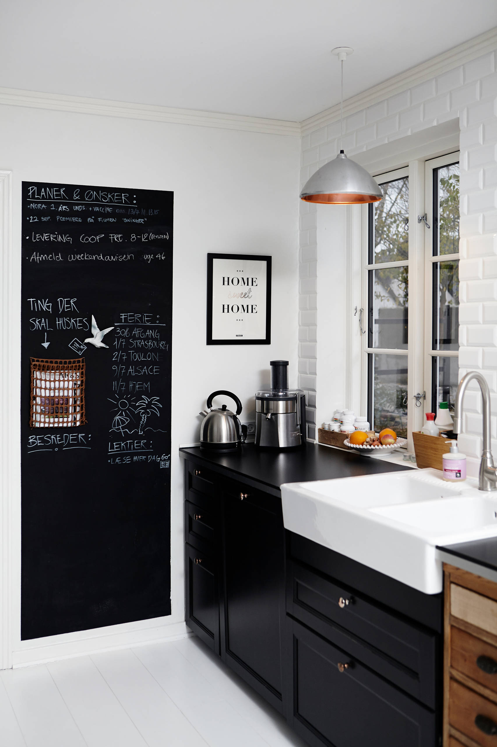 This kitchen’s inky units feel right at home thanks to matching black details in the rest of the space (blackboard wall, picture frame, small appliance details…).
