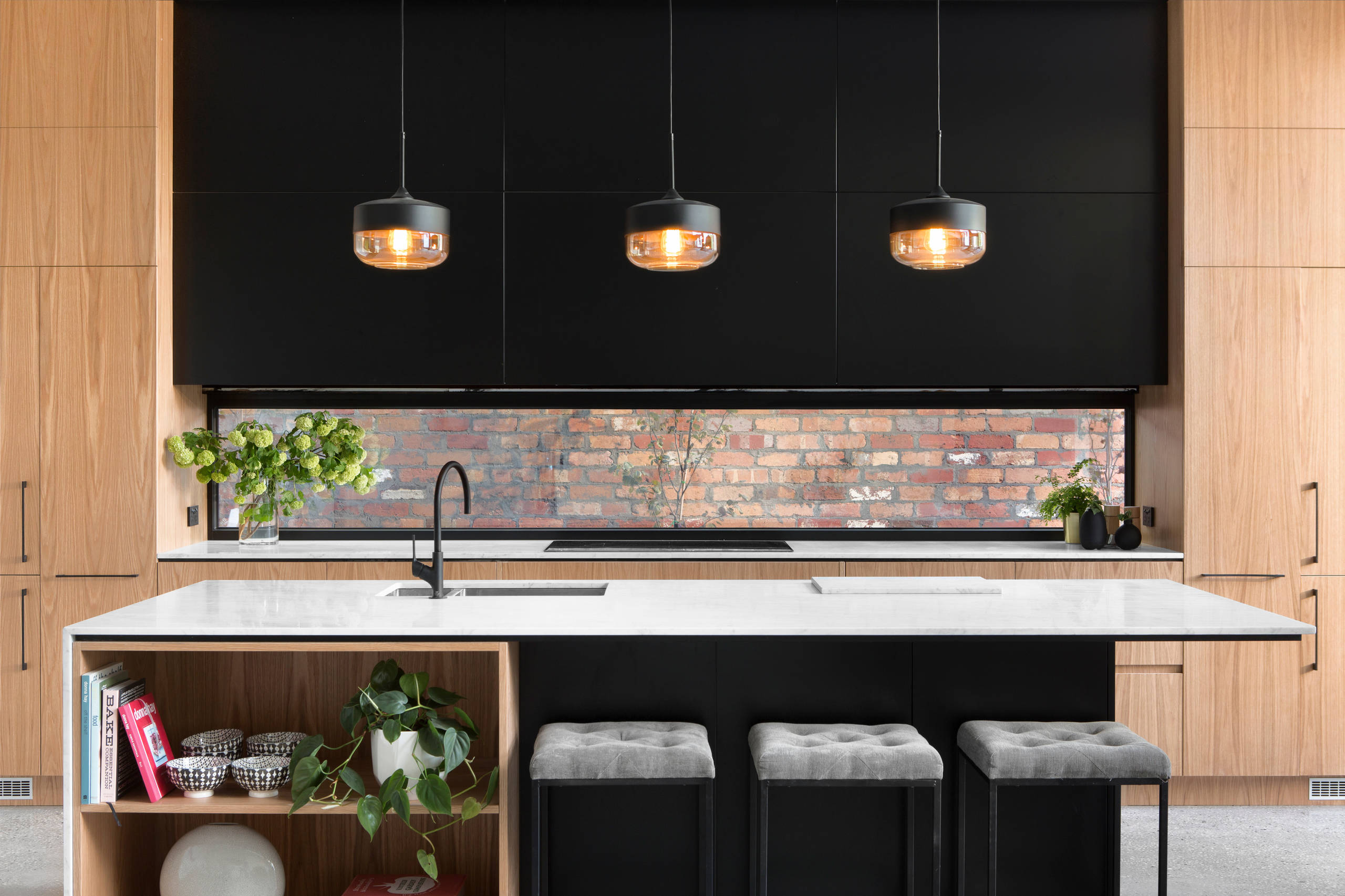 If your kitchen runs along a suitable exterior wall and you’re interested in fitting a transparent splashback like this, consider carefully what you’ll see through it, as it will become part of your interior, too. Here, the tones of the brick wall work well with the warm glow from the pendant lights and the wooden details, and even the grey of the stools and concrete floor.