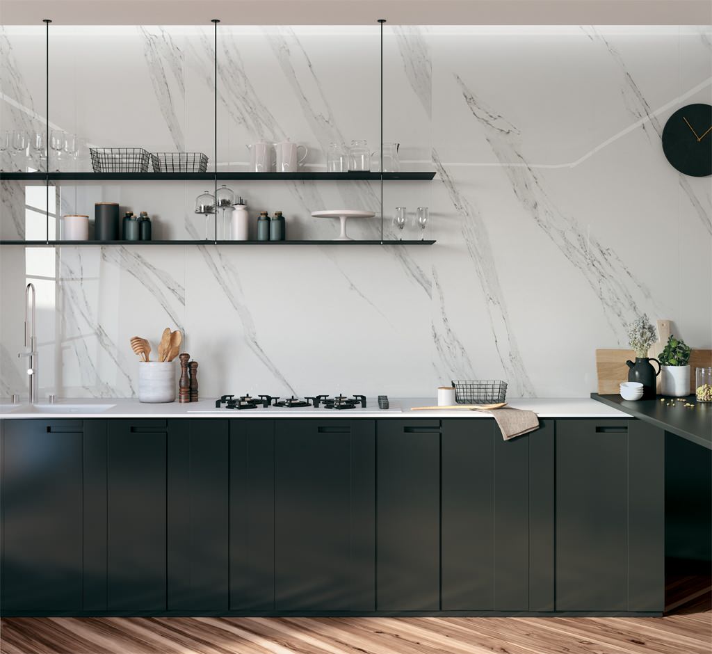 If you have the space or organisational capacity to dispense with wall units, black base cabinets cut a dramatic line across a wall of monochromatic marble… Except that this isn’t marble at all, but marble-look tiles, making the idea way more accessible.