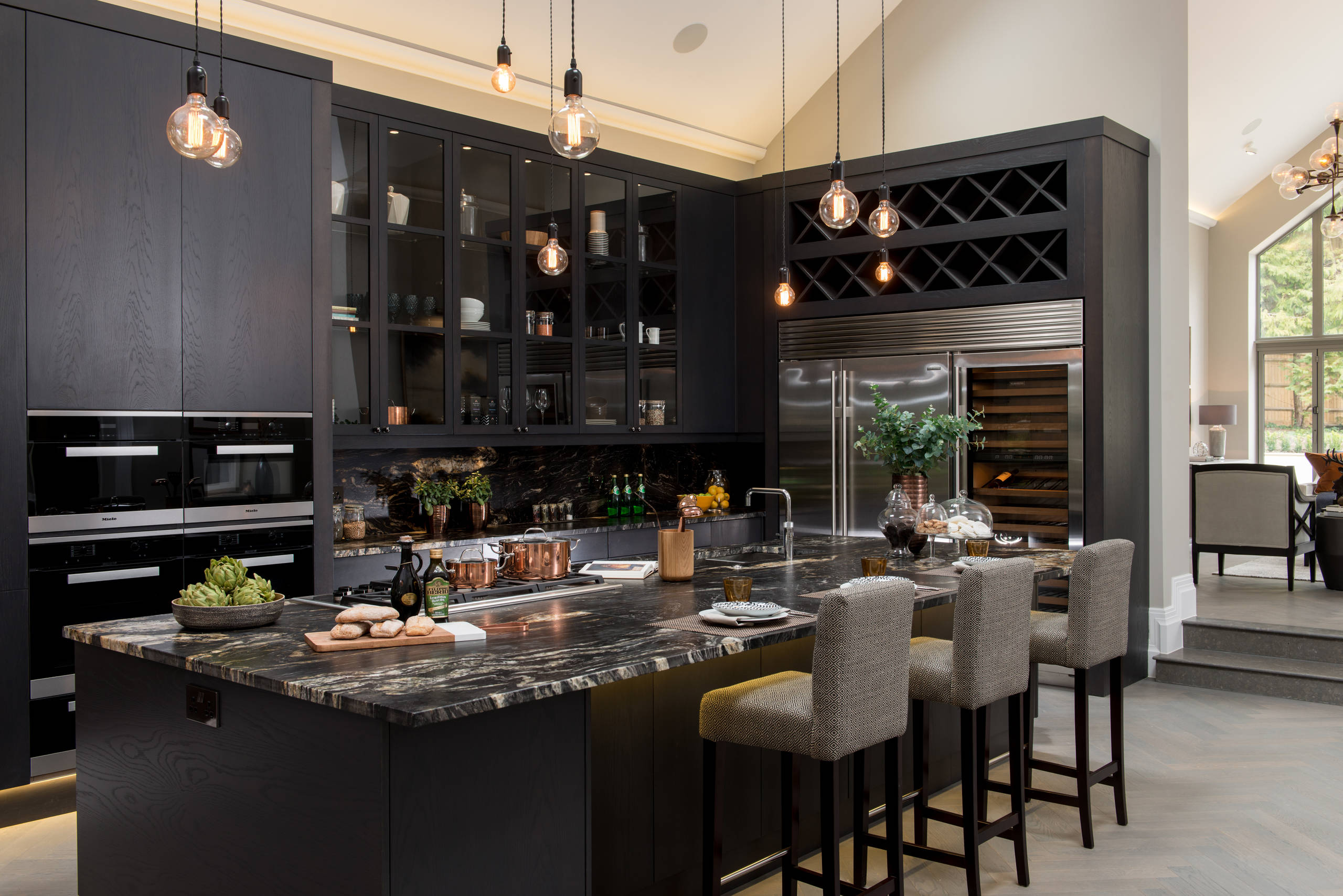 Inviting and cocoon-like, this tall corner kitchen really draws you in. This is a great example of how something on a grand scale, and in an elegant, high-end finish, can also feel cosy. The glow of the bare filament bulbs as the main lighting adds to the effect.