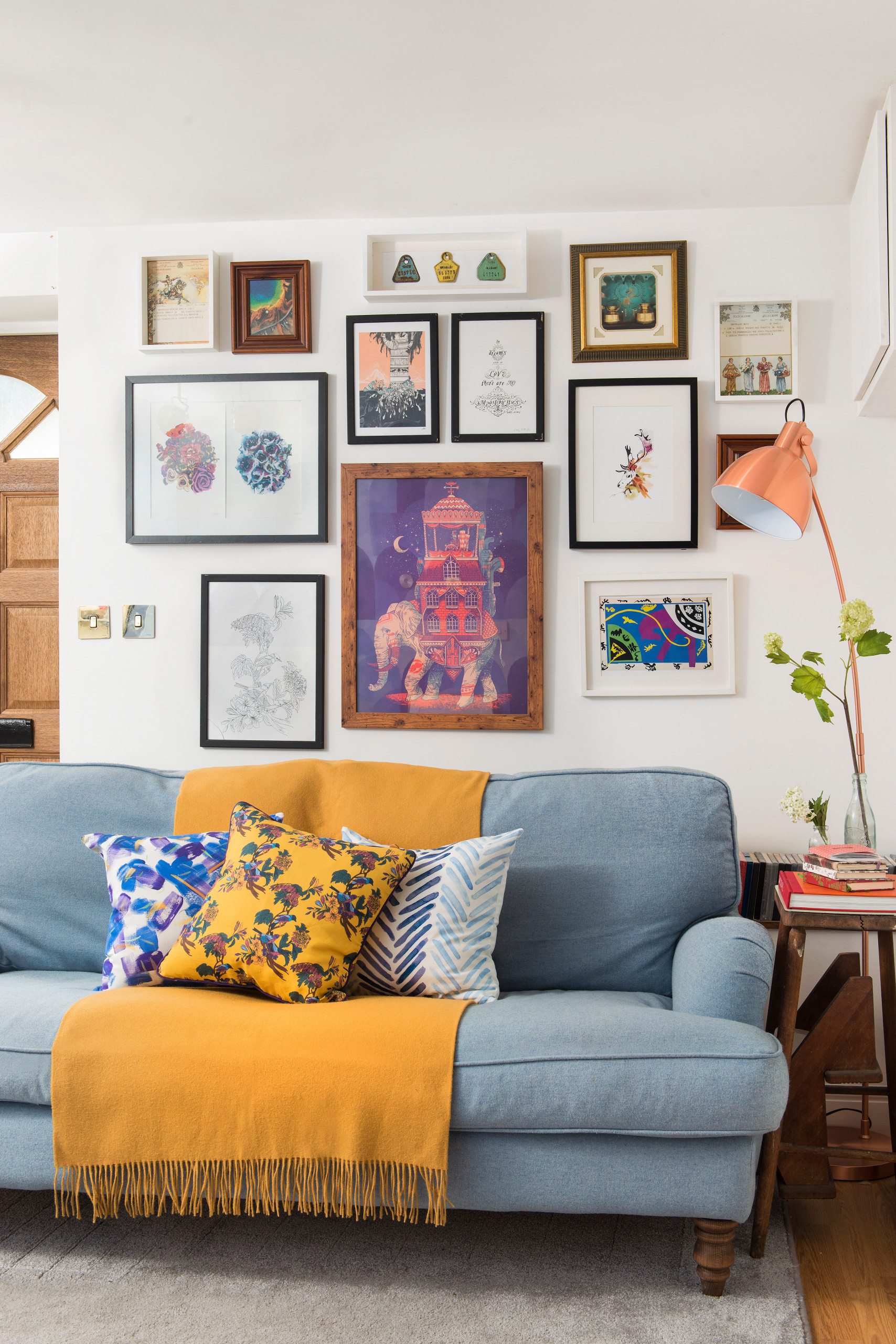 Cobalt blue is so eye-catching that even a hint of it can transform a space. Here, the cobalt tones in the cushions and artwork stand out even with the competition they’re getting from the yellows and pinks.