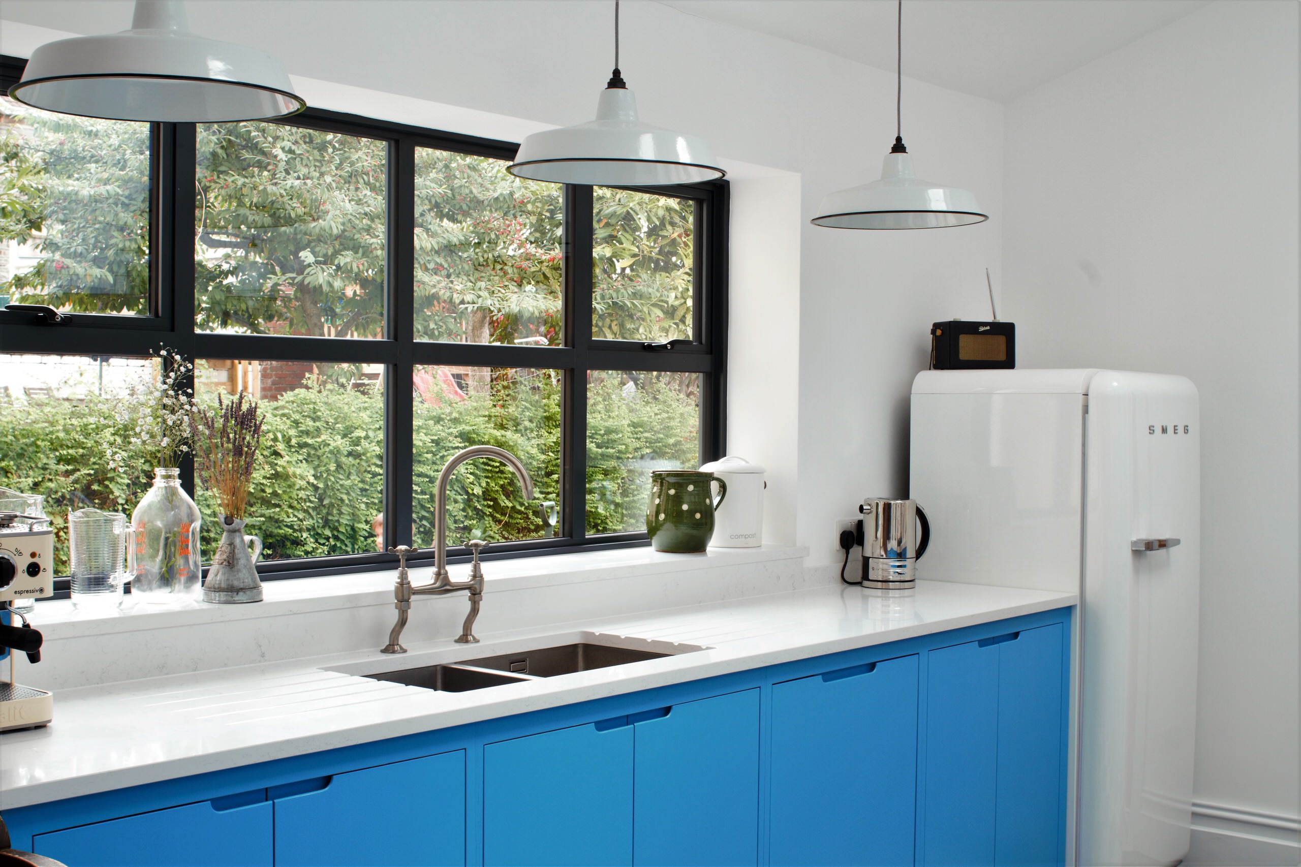 Don’t want to commit to blue units? Then consider a bright blue splashback. There are many companies who supply painted glass splashbacks, and usually you can specify the exact colour you’d like painted on the back.