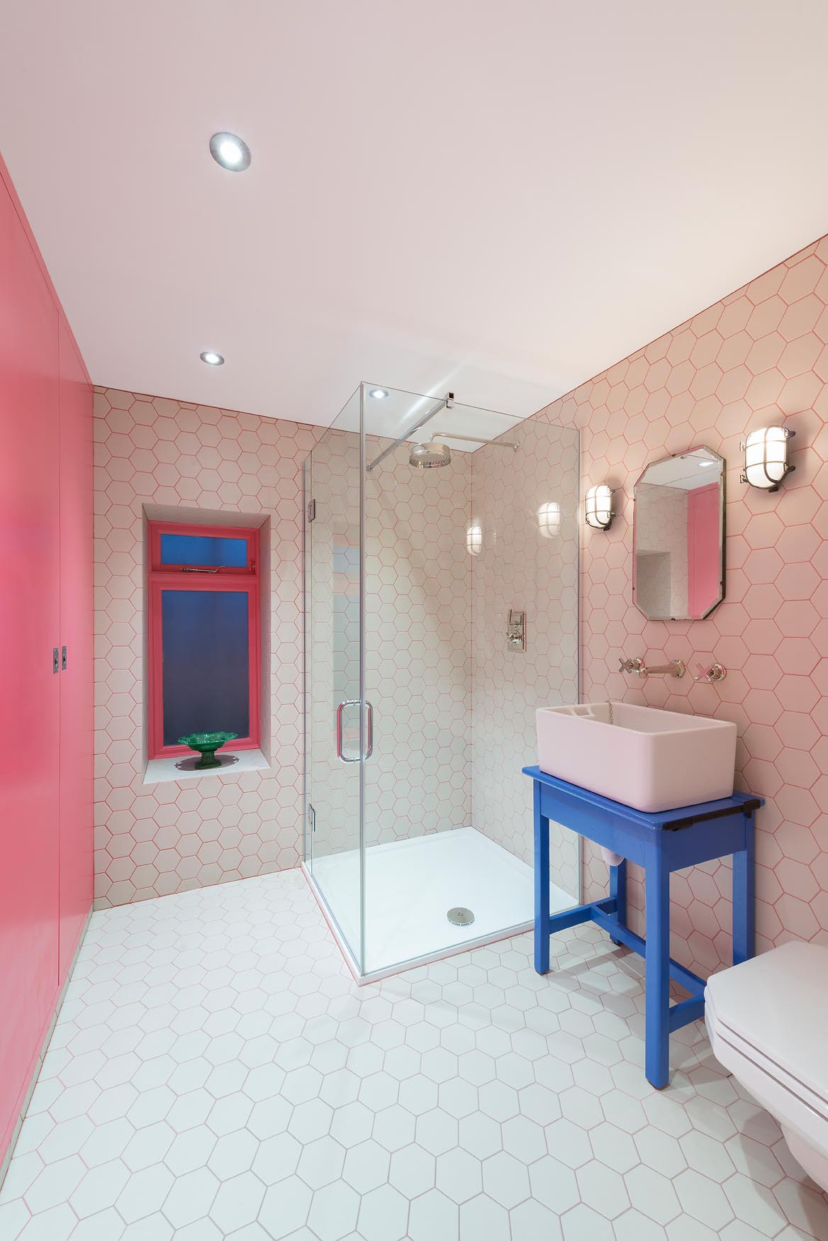 Cobalt blue looks particularly cool with another colour that is in the spotlight at the moment – pink. Here, the cobalt blue on the washstand pops out against the geometric tiles that have pink grout (how cool is that?).