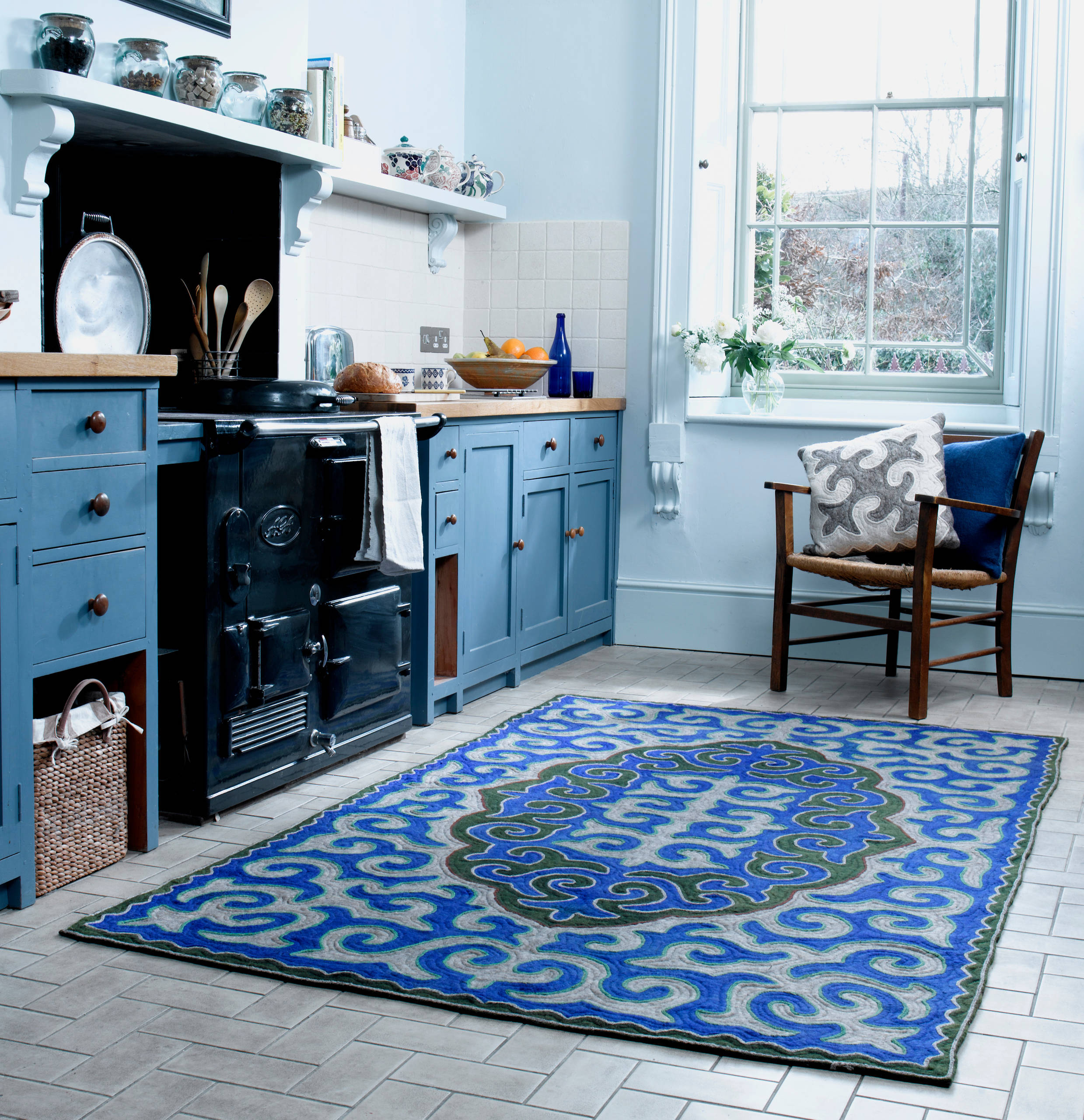 Still not sure about cobalt blue? Dip your toe in with a few accessories to introduce the colour without the commitment. Here, soft blue units have been jazzed up with a bright blue patterned rug. The beautiful design adds a gorgeous element to this rustic kitchen.